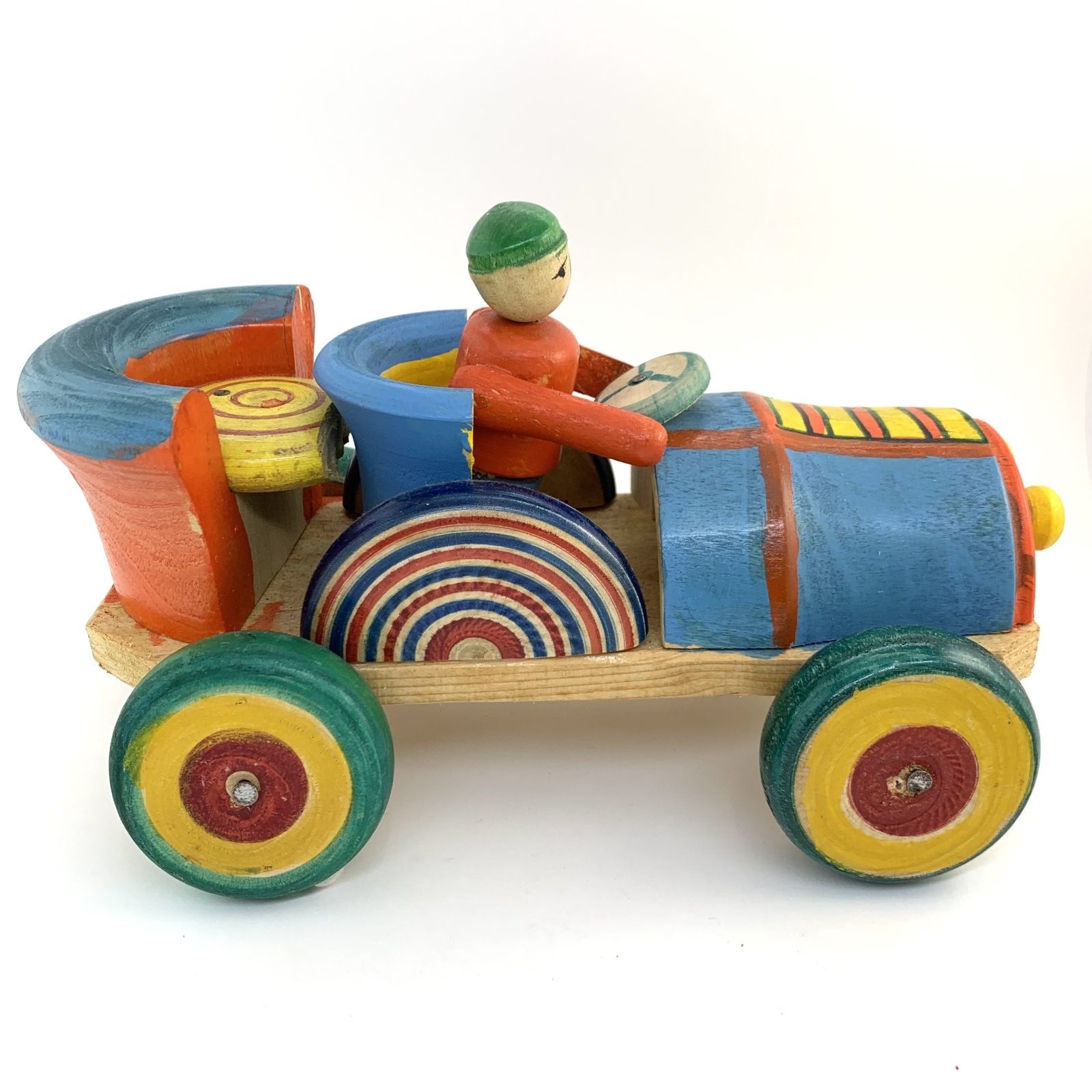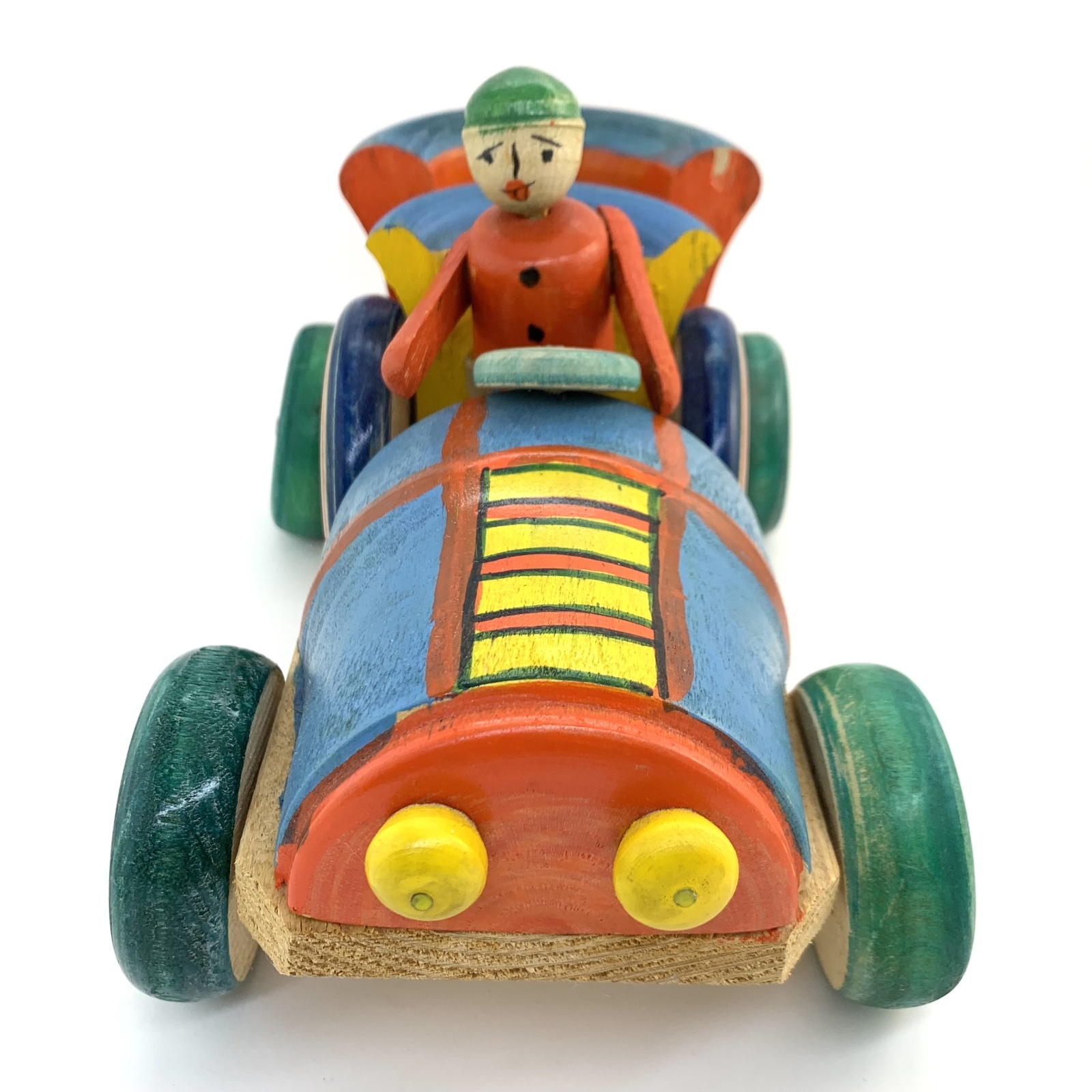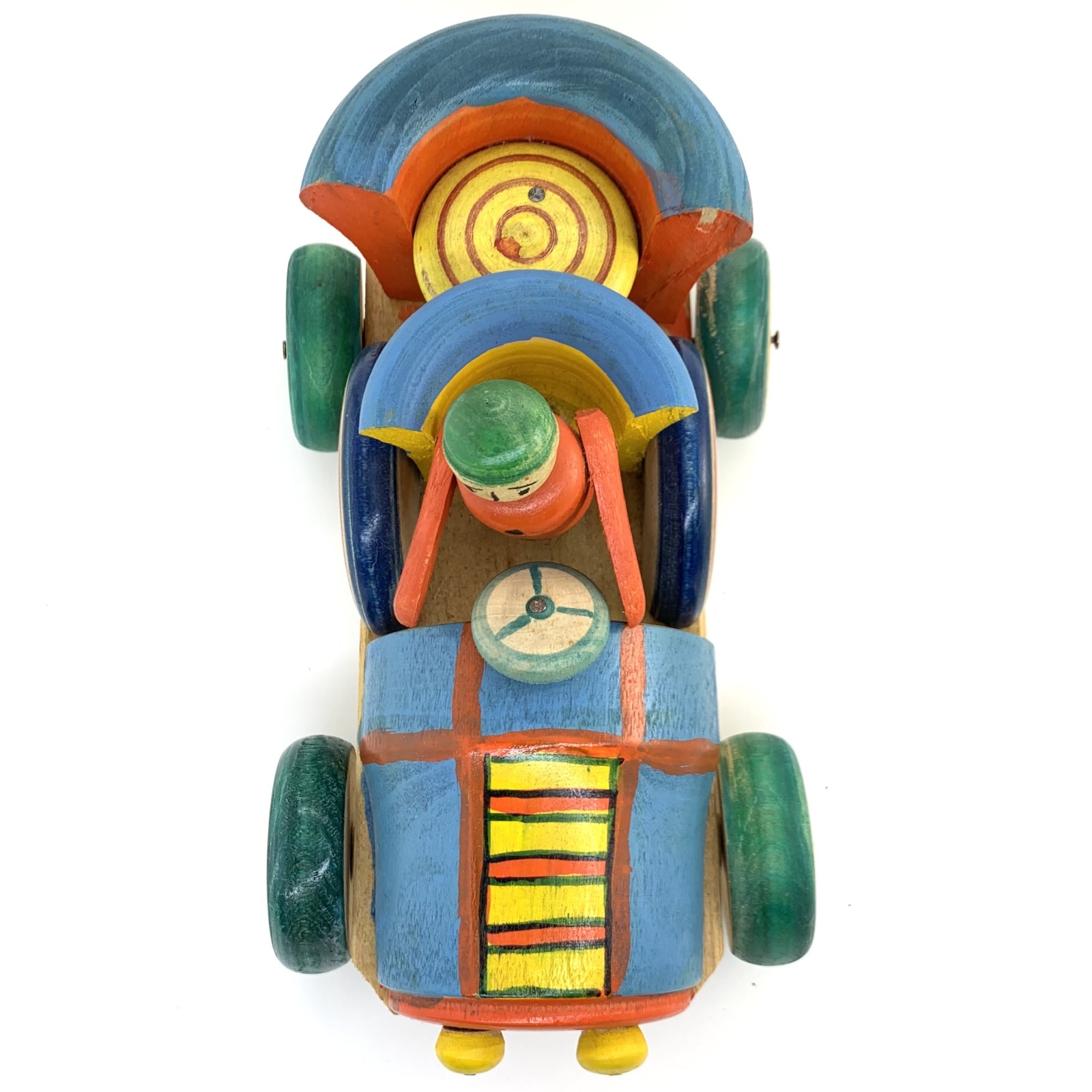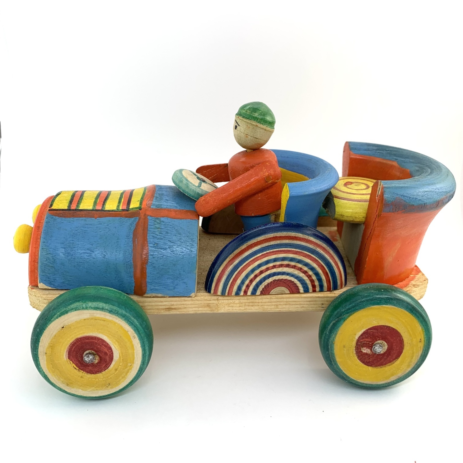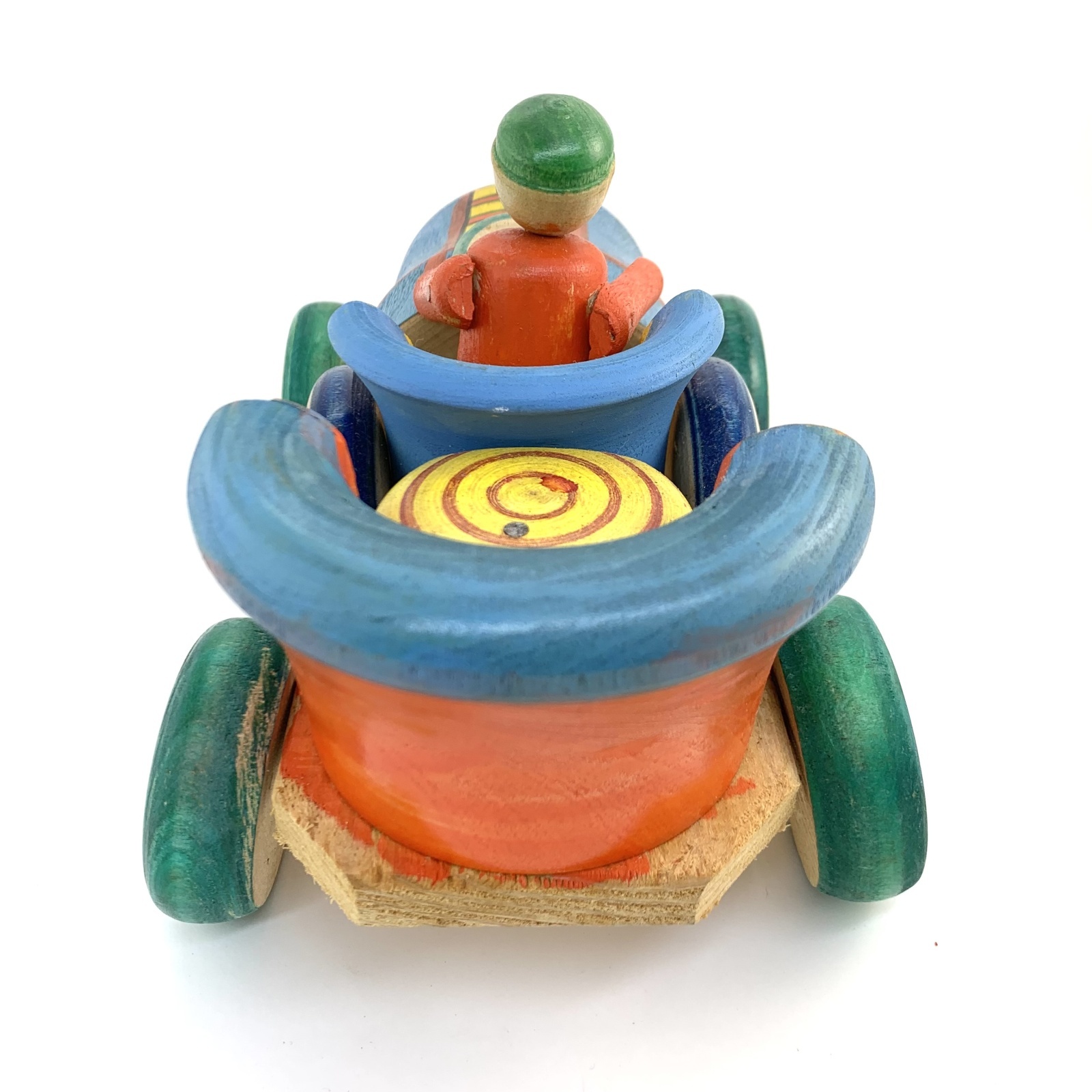 ■ロクロで挽いたパーツを組み合わせて作られている頑丈な自動車。おもちゃらしい色合いで、運転手さんの顔はとても味わいがあります。タイヤはちゃんと動きます。
