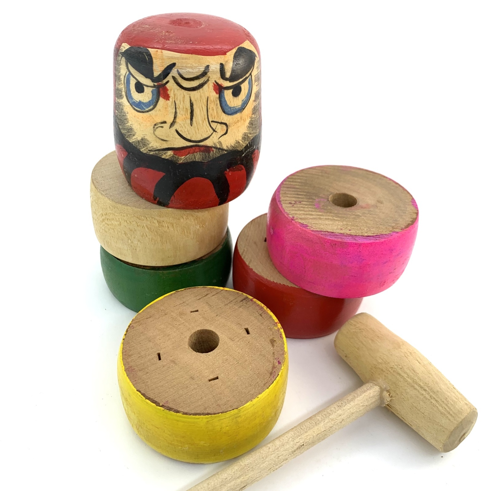 ■5段の円柱とだるま、木製ハンマーがセットになっています。
