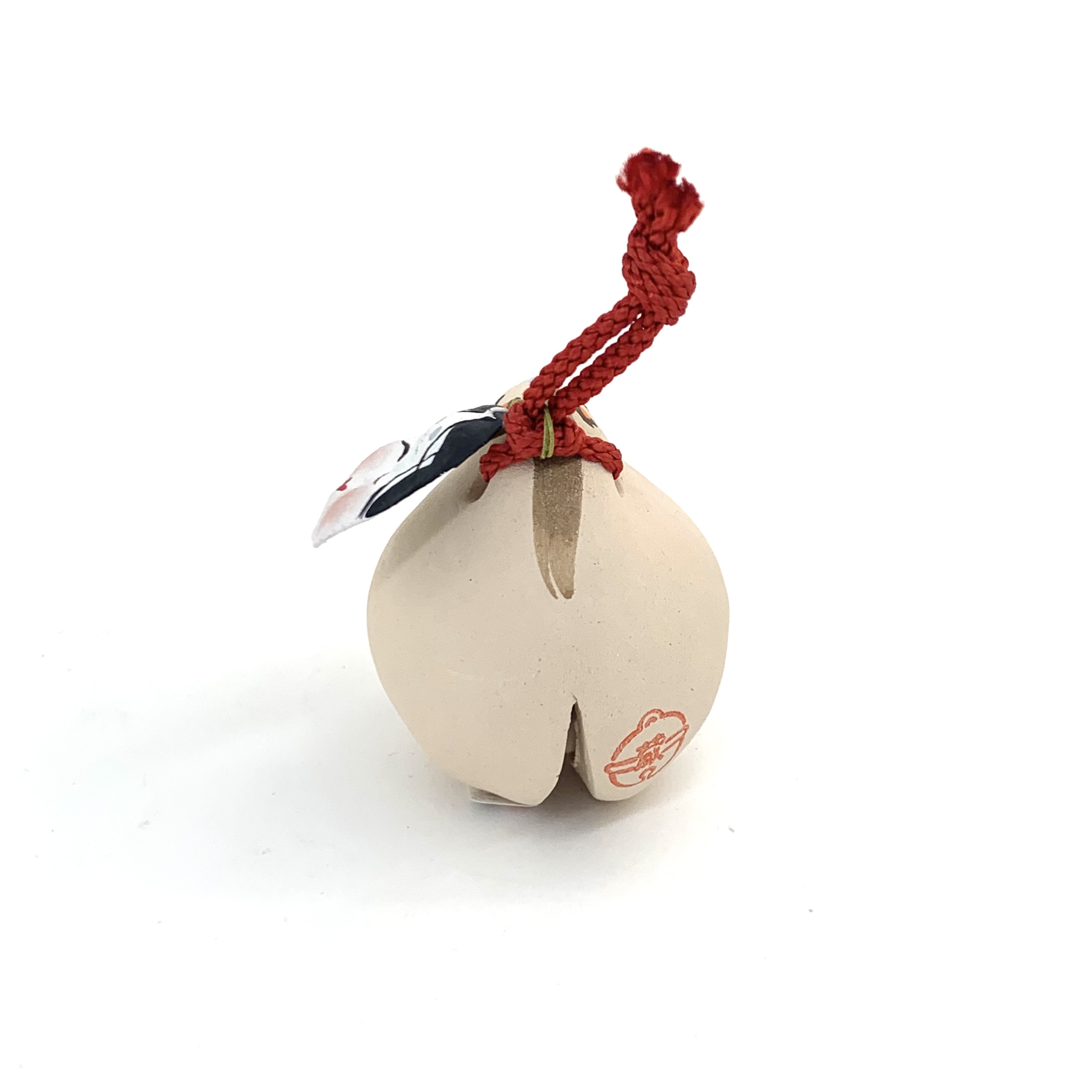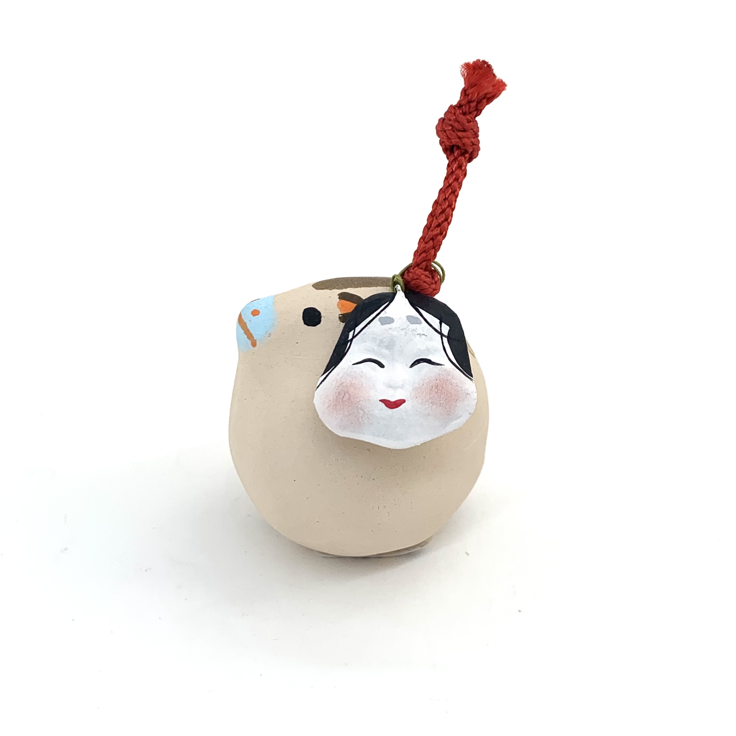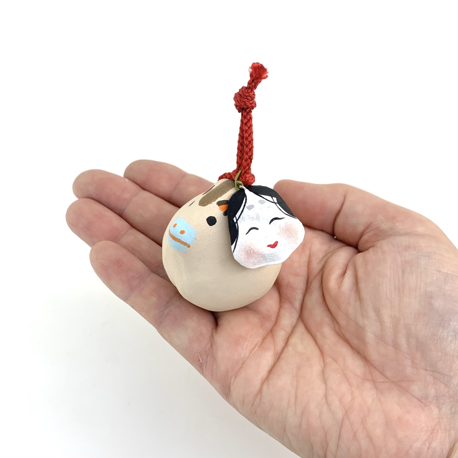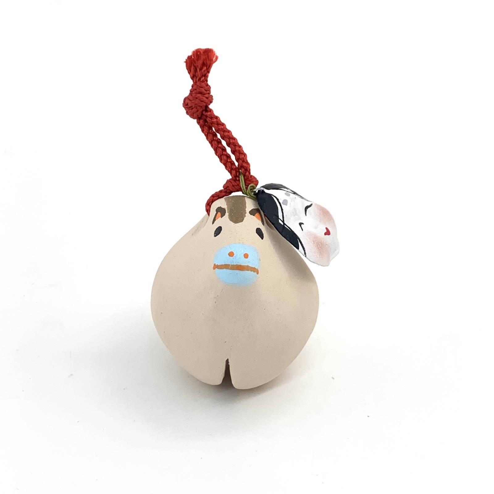 ■素焼きの土の肌を活かし、必要最低限の絵付けで表現された馬の土鈴に、小さなお多福さんのお面がついています。